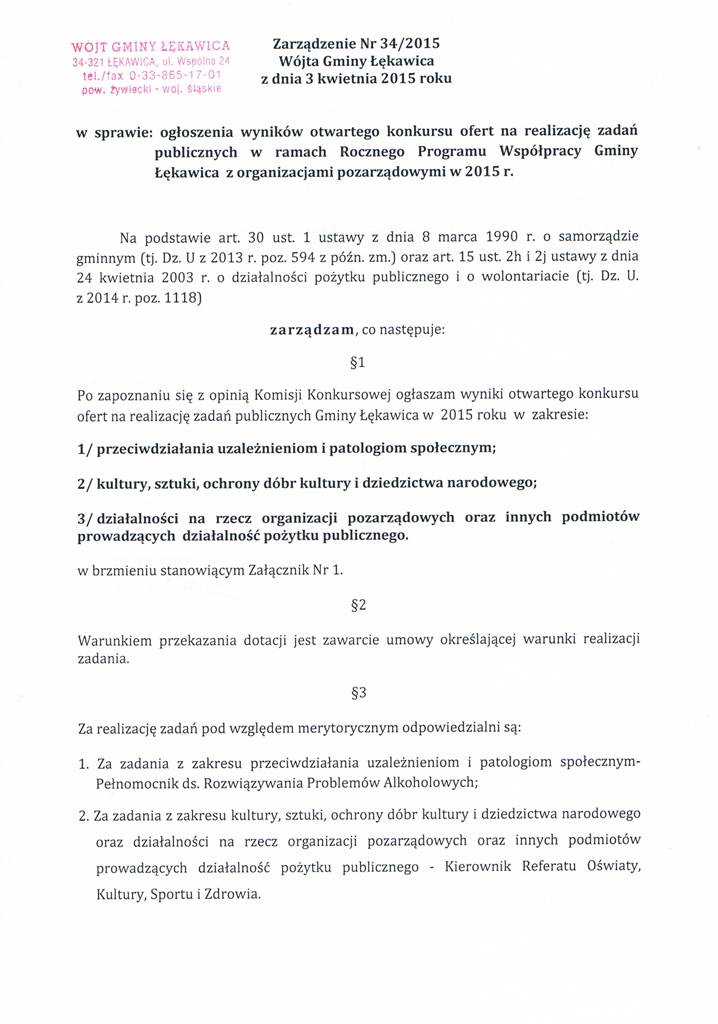 Zarządzenie nr 34/2015 Wójta Gminy Łękawica z dnia 3 kwietnia 2015r. w sprawie: ogłoszenia wyników otwartego konkursu ofert na realizację zadań publicznych w ramach Rocznego Programu Współpracy Gminy Łękawica z organizacjami pozarządowymi w 2015r.