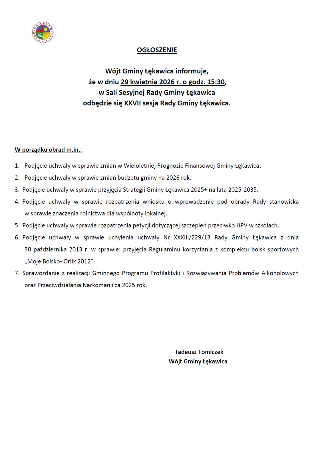 XXVII sesja Rady Gminy Łękawica - 29.04.2026 roku